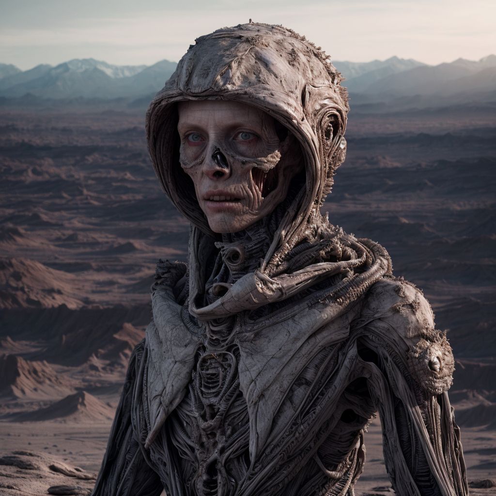 a hyper detailed cinematic portrait of a long dead explorer in a dreadful alien landscape, (folded skin), subtle details, (intricate attire), (randomness), geometric,