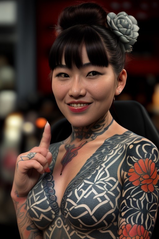 OverallDetail, intricatedetails, tattoo, irezumi, A Japanese woman in a black kimono. She is happy and shamelessly shows off face tattoos, In the background, a grave yard. The background color is grey hues only