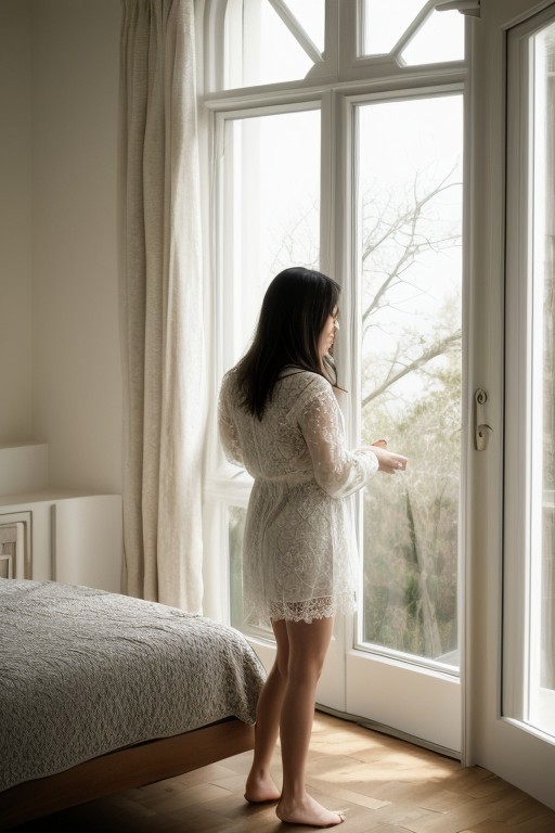 A confident woman wearing elegant lace lingerie, standing in a softly lit bedroom near a large window. The sunlight highlights her natural beauty, creating a serene and tasteful atmosphere. The lingerie is detailed with intricate lace patterns, and the overall mood is sophisticated and artistic. The colors are neutral and the background is minimalist, focusing on the elegance and subtle sensuality of the scene