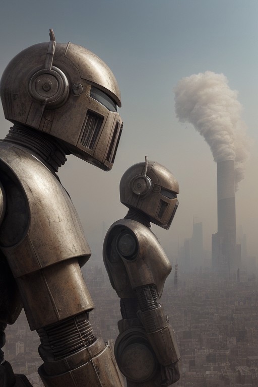 front side view, close-up, fantasy art, surrealism, grim, photorealism, hyger, a row of giant droids standing on a city wall, smog, epic, monumental, cinematic, mesmerizing, fine detail, close-up, dynamic, high detail, HDR, ultraHD, photorealistic
