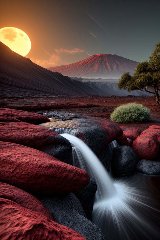 a volcanic eruption, a river of fiery red lava, a waterfall, a large red moon in the background, dramatic lighting, cinematic composition, photorealistic, (best quality,4k,8k,highres,masterpiece:1.2),ultra-detailed,(realistic,photorealistic,photo-realistic:1.37),dramatic lighting,dramatic sky,dynamic composition,volumetric lighting,intricate details,vivid colors,3d render,concept art