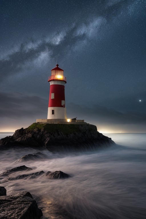 lighthouse near the sea , waves hitting rocks ,night, fog, dark atmosphere , high quality, <lora:add_detail:1>