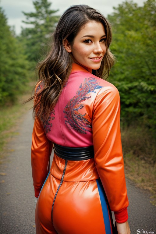 Realism_Quality_2xx_By_Stable_Yogi, close-up portrait, upper body, equirectangular 360, split lighting, realistic and detailed, highly detailed face, masterpiece, Skin texture style, Detailed skin, Skin pore, older women, 29 years old, colorful, hdr, elegant, hyperrealistic, beautiful, wide angle, extreme aerial view, epic composition, hyperrealism, ray tracing reflections, hands hidden, hands out of view, woman, multicolored clothes, multi-color clothes, huge breasts, akiryo-mai, shirnui mai, gentle smile, happy, European, tall, mature female, long wavy hair, milf, beauty, fitness trail, outdoors, cleavage, solo, 1girl, milf, large breasts, plump, skindentation, latex suit, colorful suit, hands behind the back, Claire, ginger, freckles, paisley