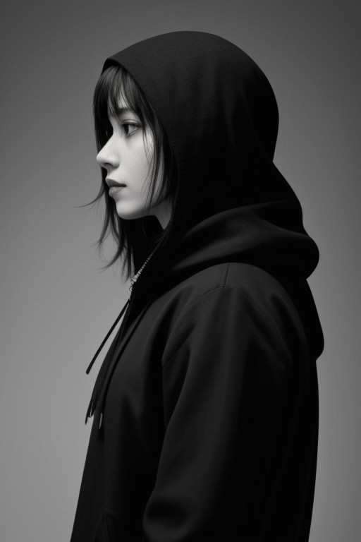 score_9, score_8_up, score_7_up, score_6_up, photo bokeh 1girl, solo, breasts, upper_body, monochrome, greyscale, hood, from_side, profile, black_background, hood_up