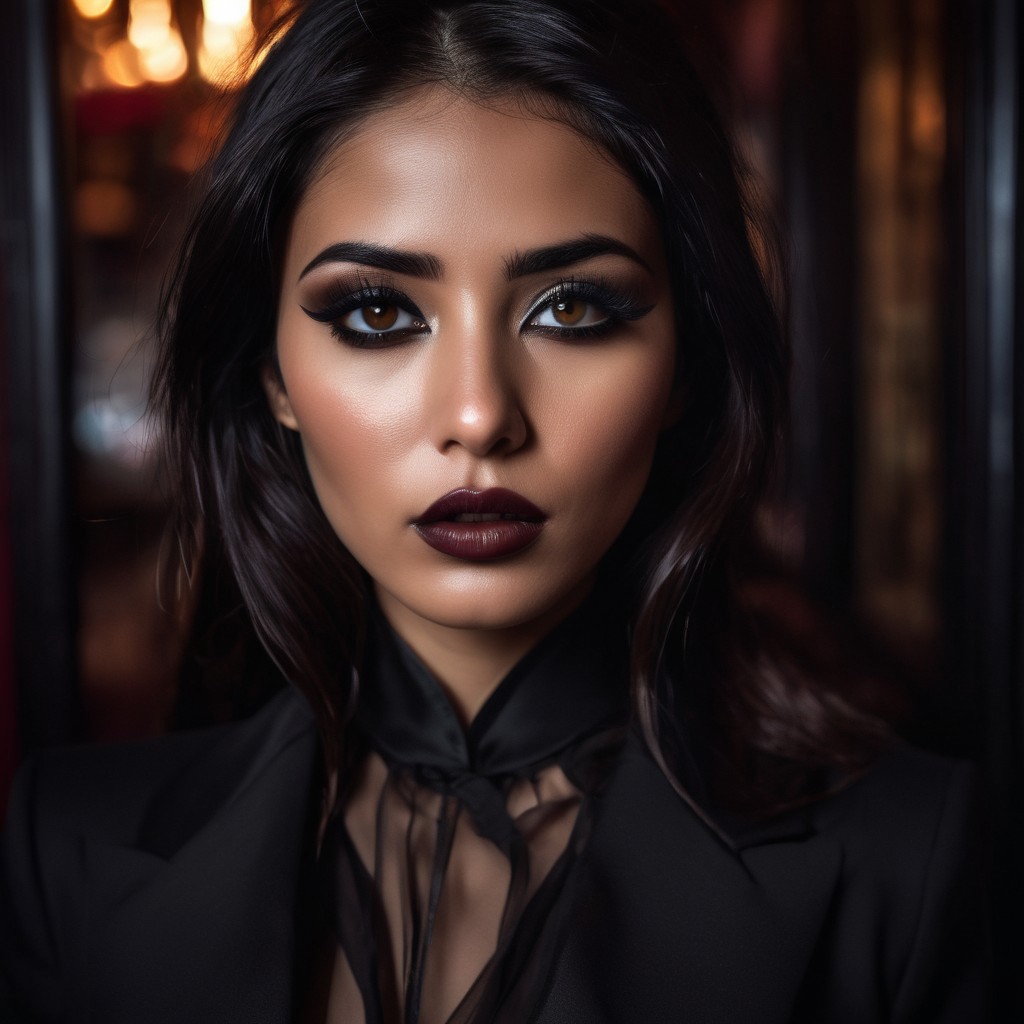 a mysterious woman, portrait, closeup, exotic features, mix of middle eastern and asian, dark hair, smoky environment, dark and moody bar, sultry eyes, dark eye shadow, erotica, glossy lips, hint of cleavage, collar bones,