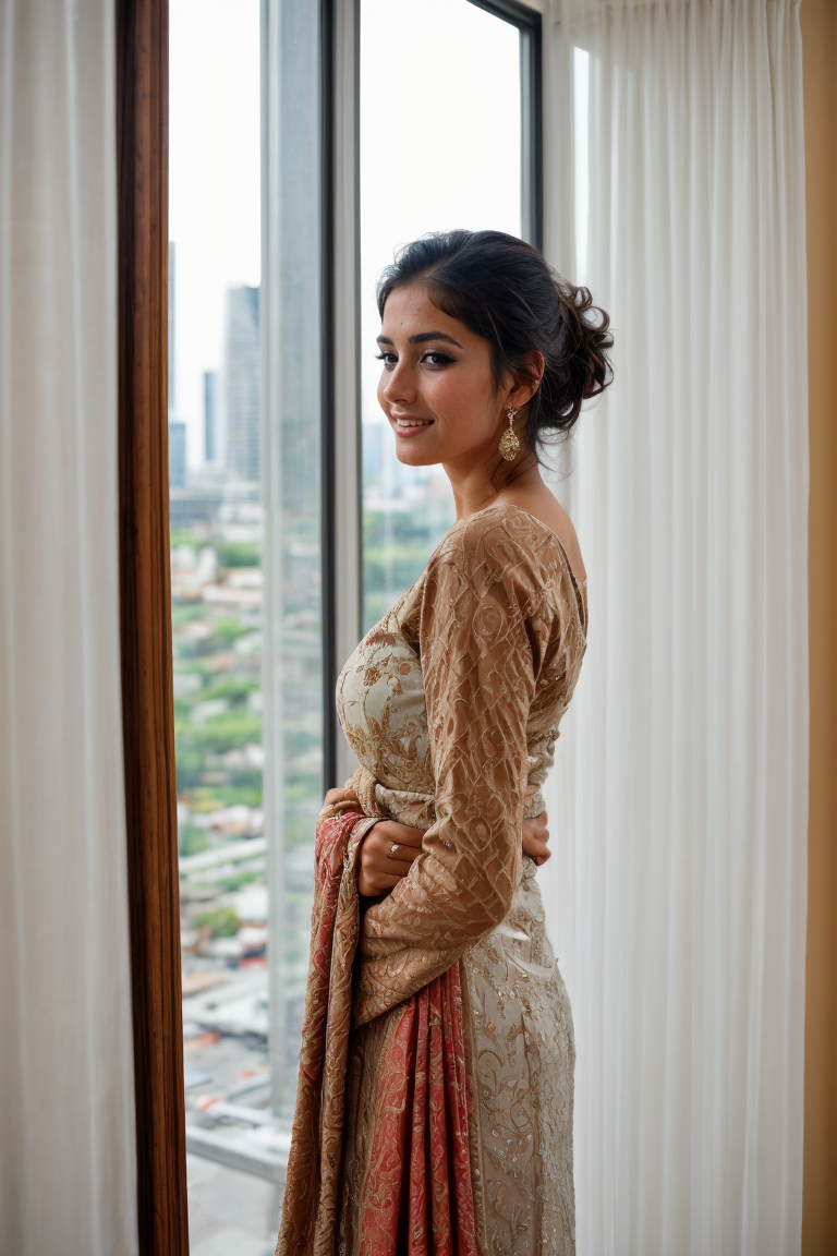 wide angle photo, ovfi, view through window,( view of city tower block through window:1.3), (london:1.1), iconic london skyline, {front|side|back} view, candid amateur, beautiful sexy sensual playful petite small person pakistani woman wearing ornate detailed embroidered {kameez|lehnga|saree}, bay windows, large windows, <lora:buildings view from indoors_epoch_9:0.5>, <lora:add_detail:0.5>, knowing smile, masterpiece, best quality, absurdres, highres, 4k, intricate details, highly detailed, <lora:real_skin:0.7> skin, blushing, shy, <lora:retromanba:0.5> Yamanba (dark skin), (focus on background:1.2), RAW photo, 8k uhd, dslr, soft lighting, high quality, film grain, Fujifilm XT3, lr