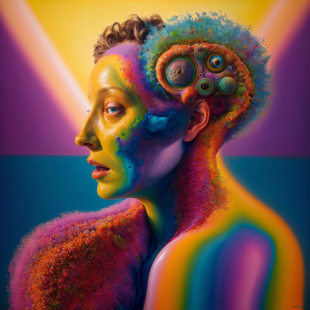 a hyper detailed( (surreal:0.3):0.6) abstract acrylic painting of a woman, deformed forms, evocative subjects, rim light, colorful sunlight, thomas desjardins, deijardon,