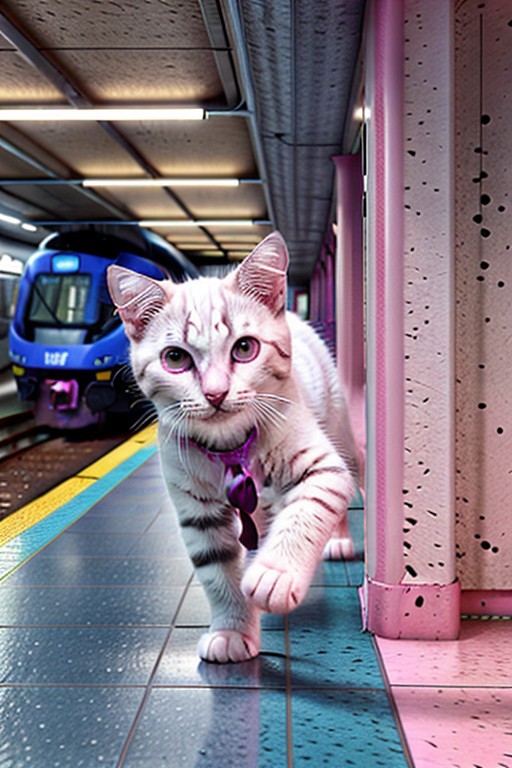 Capture a full hyper-realistic photograph of an adorable white kitten running in a Subway station corridor,jpsta, wearing a blue tie, train_station,on stairs,interior,indoors,UGPW, (pure magenta background,transparent background:1.2), cutest kitten in civitai, side view, chubby kitten, short legs, close up, c4d, blender, raytracing, unreal engine 5, render 3d,