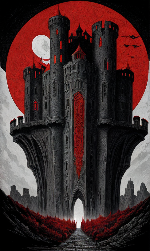 Ruined dramatic castle, black red colors illustration by Aaron Horkey detailed, 8k, quality, artstation, Intricate Details