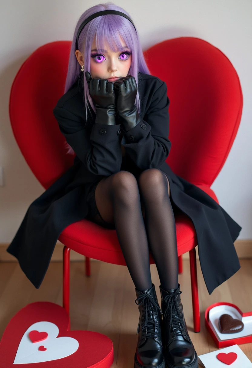 a woman dressed all in black, she wears a black overcoat over black jean shorts, she has black tights and wears fashionable black boots, she has black leather gloves, her hair is light purple, her eyes are purple with hearts for pupils, she looks bored, she sits on a red chair shaped like a heart, under the chair are heart shaped chocolate boxes as well as envelopes closed with hearth shaped stickers,
