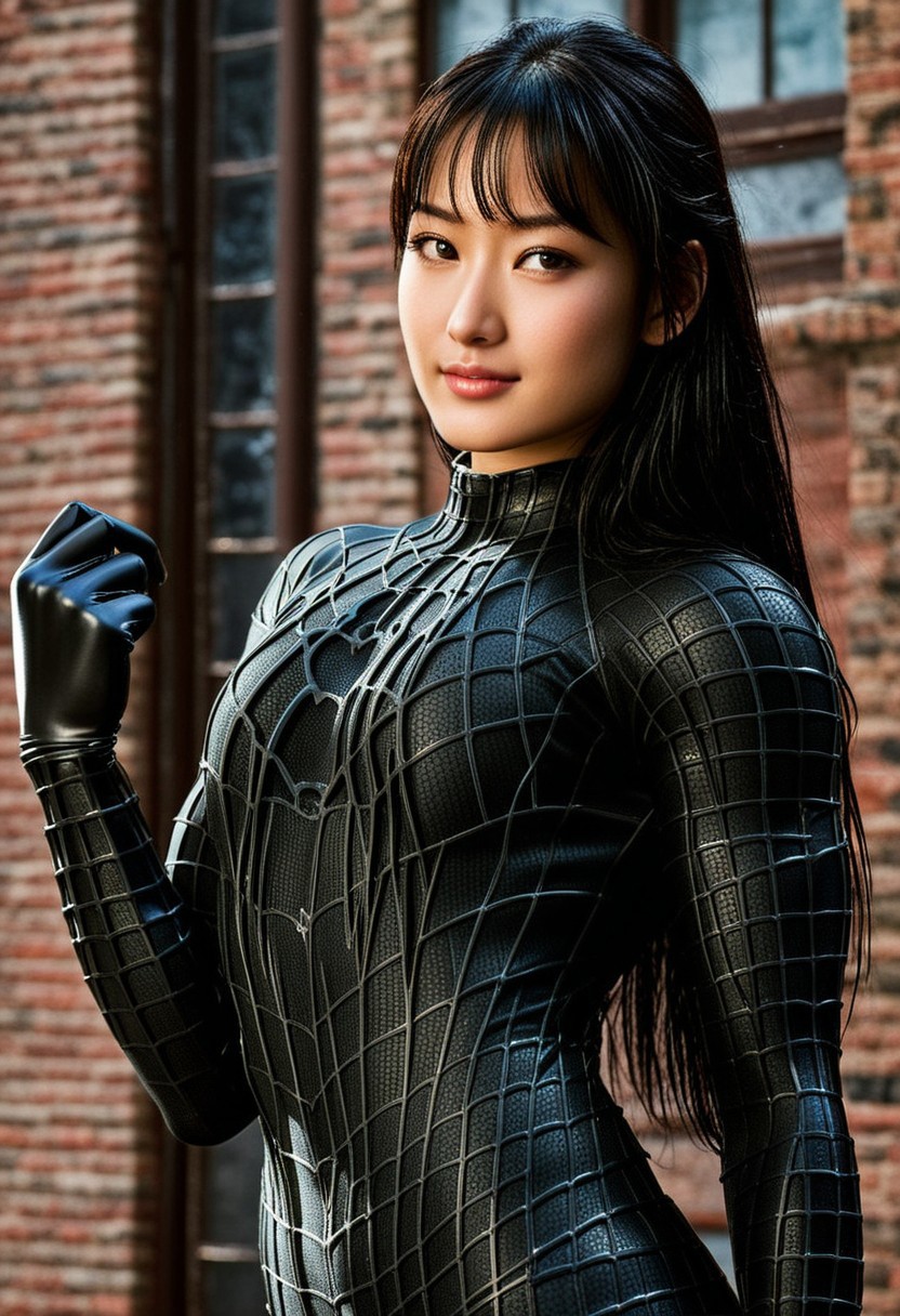 score_9, score_8_up, score_7_up, best quality, realistic, masterpiece, beautiful detail, hyperrealistic, 1girl, korean girl, on a building, professional model of <lora:Spider-Man:1.5>, wears ultra - detailed black raimi spider - man suit, ultra - detailed and grained black raimi spiderman suit, suit covered entire body and hand, black spiderman gloves, straight hair, wet, cute handpose, light smile, (full body on camera), big breasts, (on a gym), muscular bodybuilder girl, close up, octane render, highly detailed, volumetric, dramatic lighting, (highest quality:1.1), (HDR:1.3), (top quality, best quality), realistic, high definition,