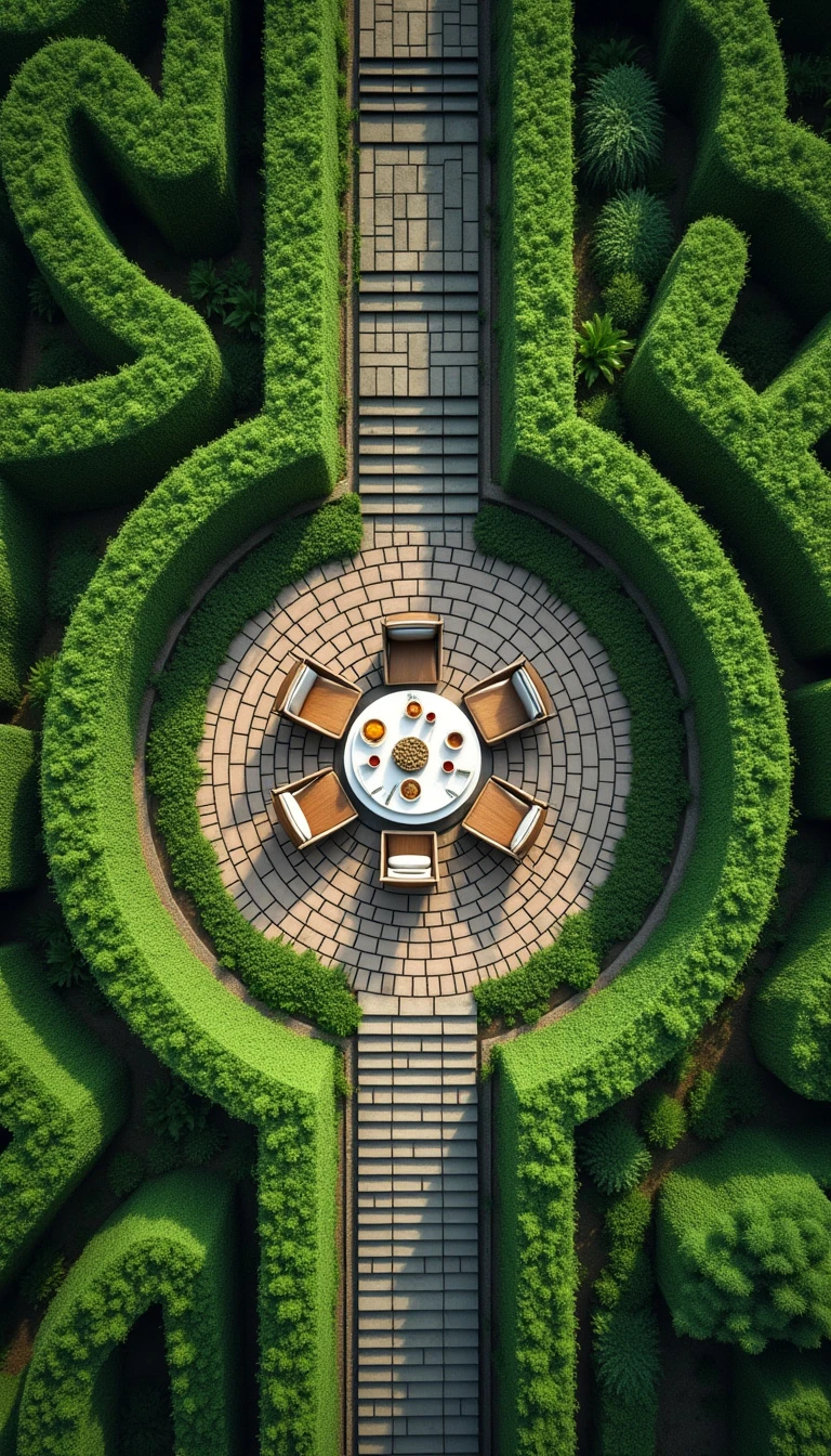 a garden maze, top down view, in the center is a circular platform with a table and chairs set up for tea,