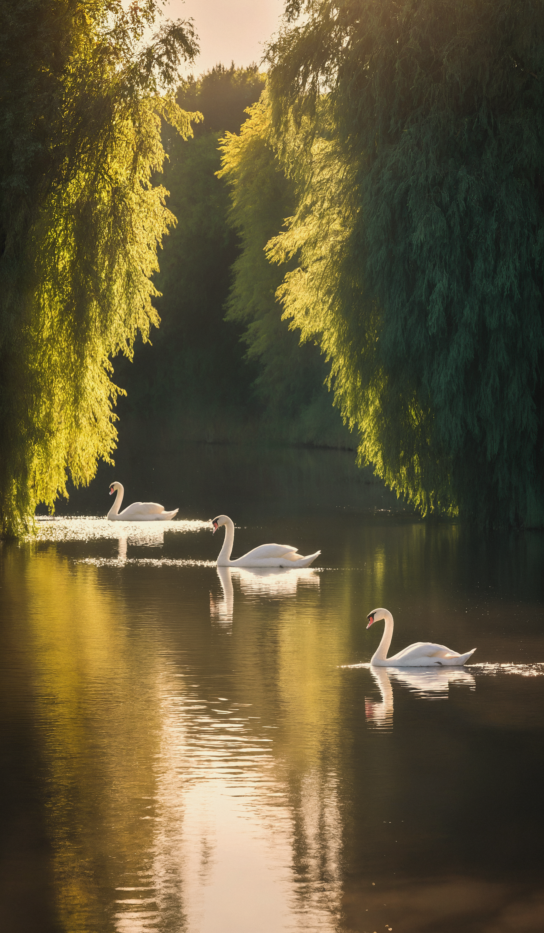 Swans on Eure River, Eure-et-Loir department , Centre-Val de Loire region, France, Europe. copy space, design template, breathtaking photograph, dramatic light, award-winning, professional, highly detailed . 35mm photograph, film, bokeh, professional, 4k ,minimalistic, daylight, warm atmosphere, cinematic look, simple look, simple style, dramatic scene, unusual scene