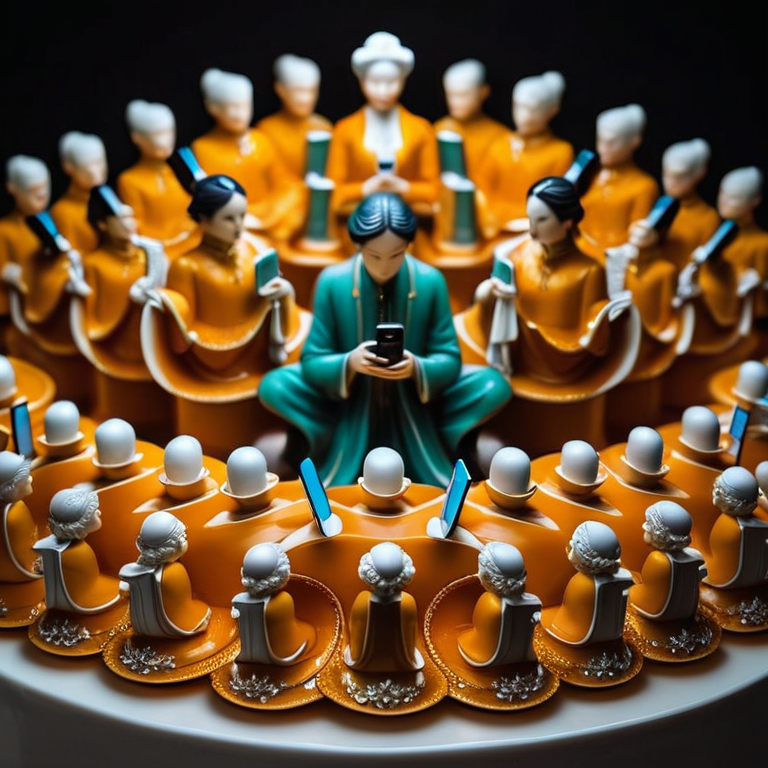 Porcelain people figurines staring down at their phones, intricate, delicate, detailed, (Canon TS-E 17mm f/4:1.21), pristine quality wallpaper