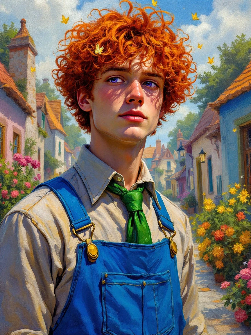 Impressionism Style, oil paints, visible strokes, huge brushstrokes, Style of Claude Monet, Style of Camille Pissarro, Style of Edouard Manet, Style of Edgar Degas, he has bright red hair that is extremely curly, 3a hair type, he wears a shiny green necktie and shiny blue overalls with blue straps, the overalls are over a button down shirt in a muted color, his eyes are purple, butterlies in the distance, the background is a colorful village that focuses on fantasy elements,
