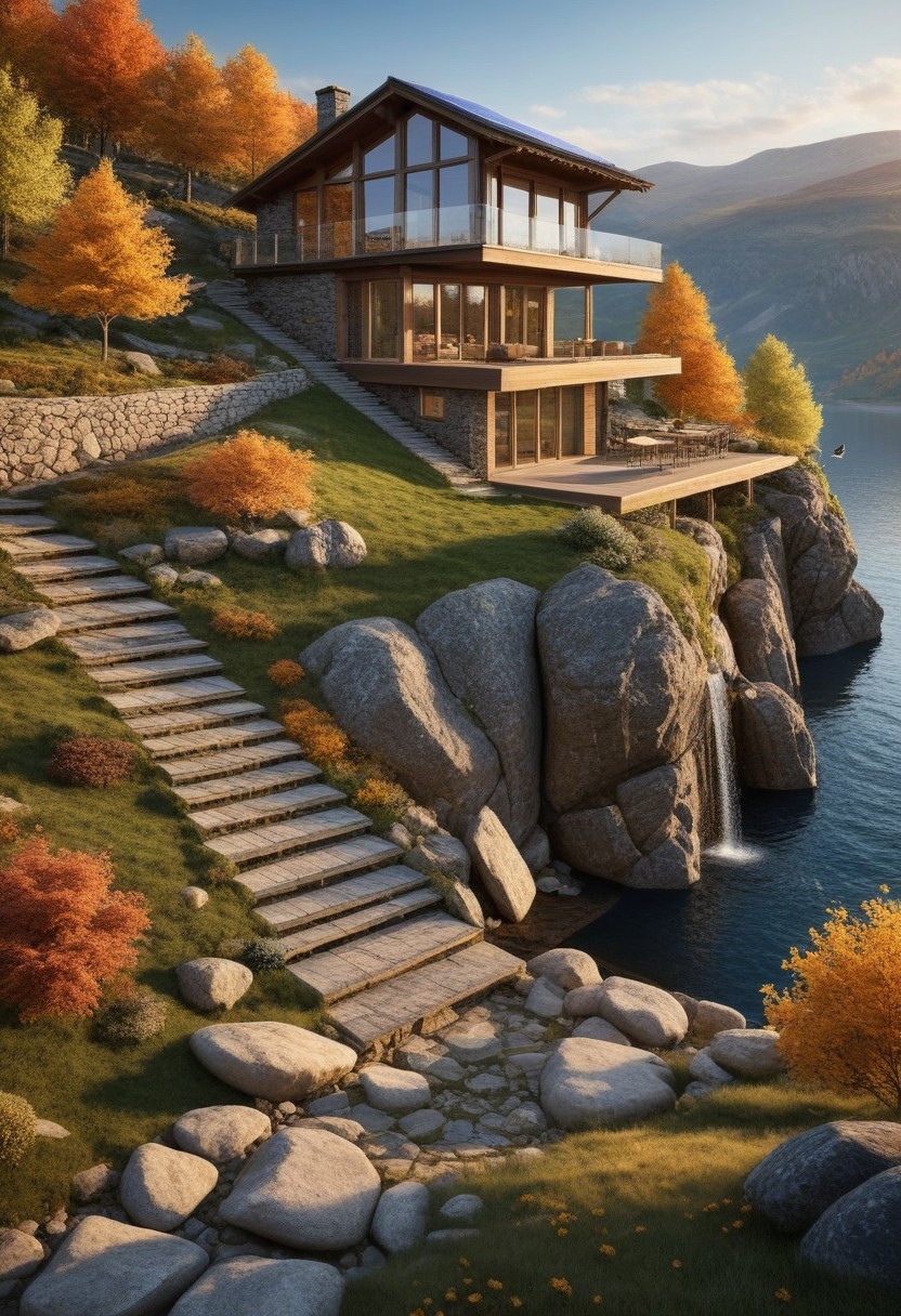 ultra-realistic image with high resolution and stable focus correct and accurate anatomy, correct and accurate objects, perfect detail, in the architectural style of a family house built of stone and wood merging with nature, designed for ecological neutrality of natural materials, in the mountains, forest ,garages,wide porch,outbuildings,table chairs,barbecue,fire pit,swimming pool,cut into the rocks,grass roof,steps,stone path,waterfall,lake,river,ultra realism,photo realism,single story,multi story,slope, wind generators,solar panels,sunset,birds in the sky,fairy golden autumn season,close up