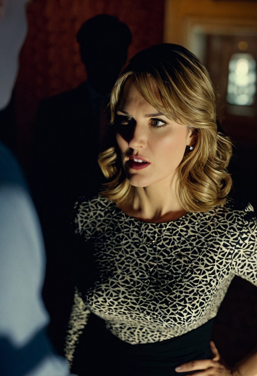 shot from above,50s Film thriller, full body shot, panoramic view (((mia malkova and Fiona Bruce angry face talking to Fredrik Ljungberg ,with a shadow on her face casting shadow style cucoloris patterned illumination, shallow depth of field, vignette, highly detailed, high budget, bokeh, cinema scope, moody, epic, gorgeous, film grain, grainy.,digital artwork by "moebius"