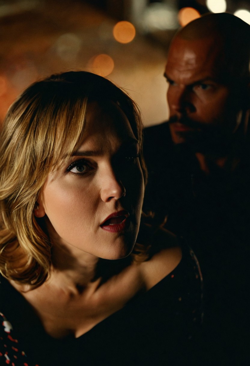 shot from above,50s Film thriller, full body shot, panoramic view (((mia malkova and Fiona Bruce angry face talking to Fredrik Ljungberg ,with a shadow on her face casting shadow style cucoloris patterned illumination, shallow depth of field, vignette, highly detailed, high budget, bokeh, cinema scope, moody, epic, gorgeous, film grain, grainy.,digital artwork by "moebius"