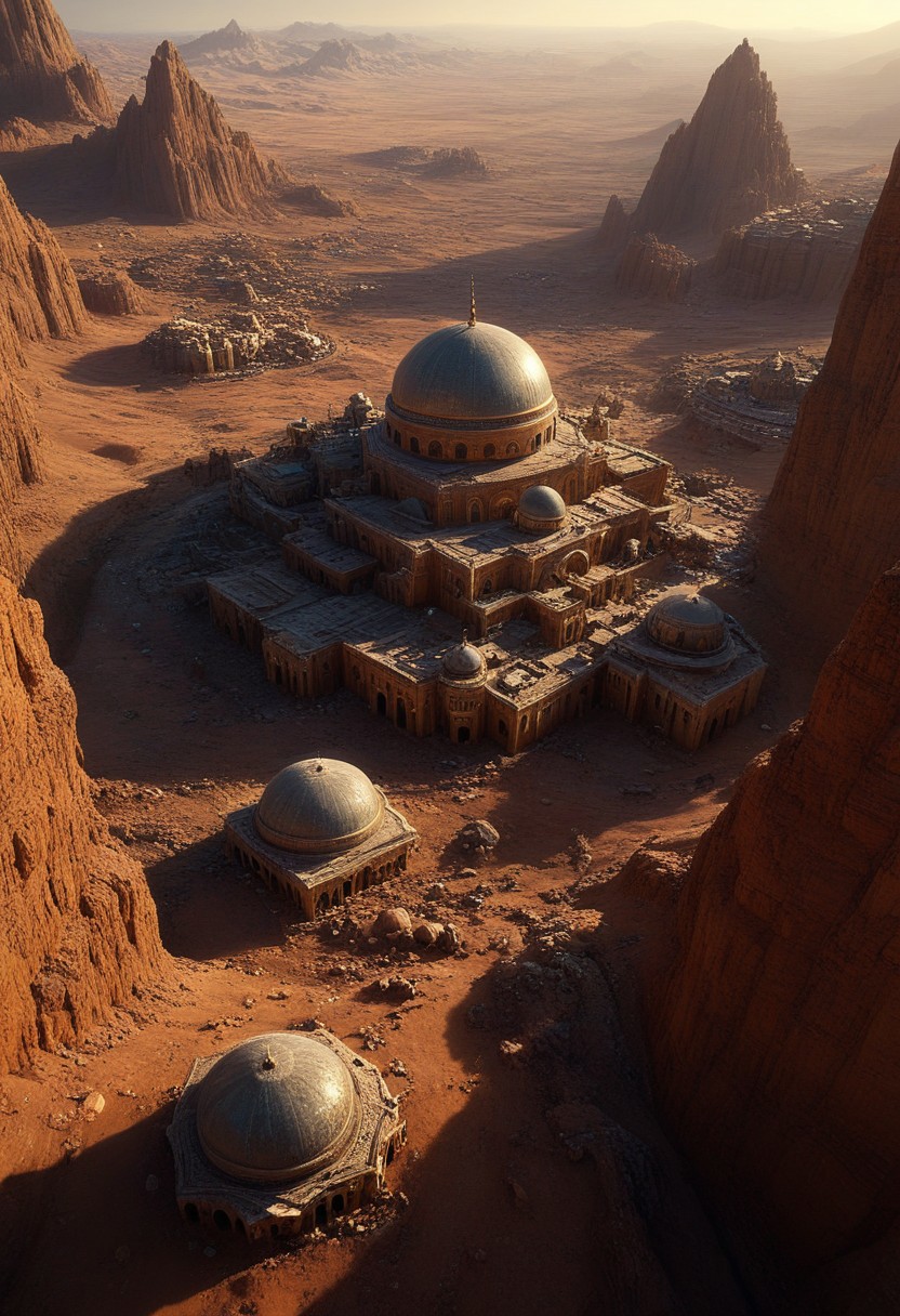 beautiful landscape, 64k, UHD, ((masterpiece, ultimate quality)), sharp focus, beautiful scenery, highres, highly detailed, photo, realistic, photorealistic, best_of George Lucas art style , arabic islamic style, (a deserted planet (on the bottom left (dome like houses))(on the top right (twin giant planets))) cinematic, artistic, highly intricate details, masterpiece, best quality, 8k, UHD