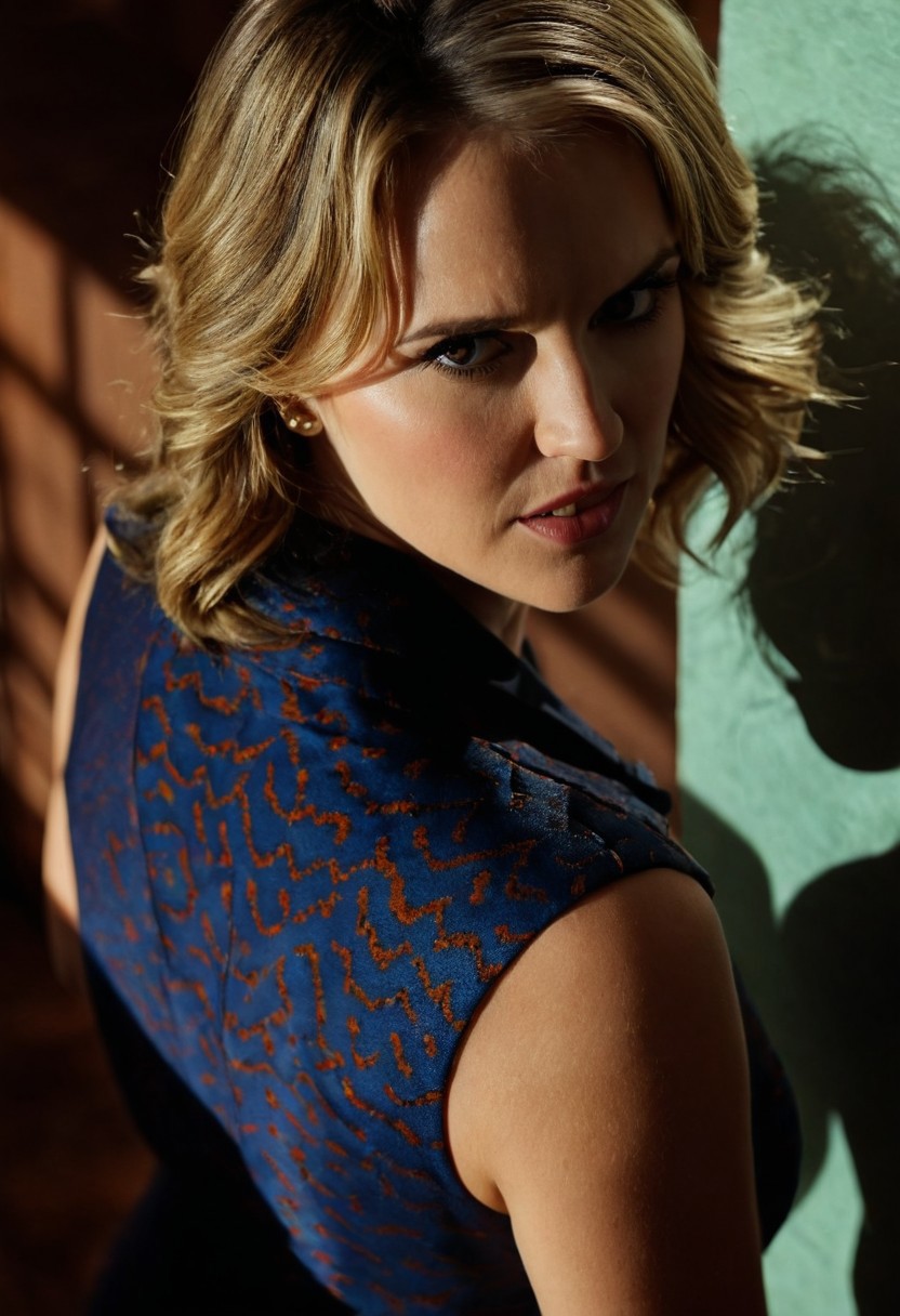 shot from above,50s Film thriller, full body shot, panoramic view (((mia malkova and Fiona Bruce angry face talking to Fredrik Ljungberg ,with a shadow on her face casting shadow style cucoloris patterned illumination, shallow depth of field, vignette, highly detailed, high budget, bokeh, cinema scope, moody, epic, gorgeous, film grain, grainy.,digital artwork by "moebius"