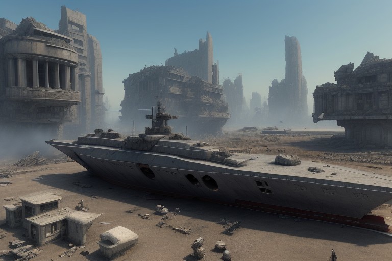 a space pirate battleship among the ruins of an advanced, futuristic city