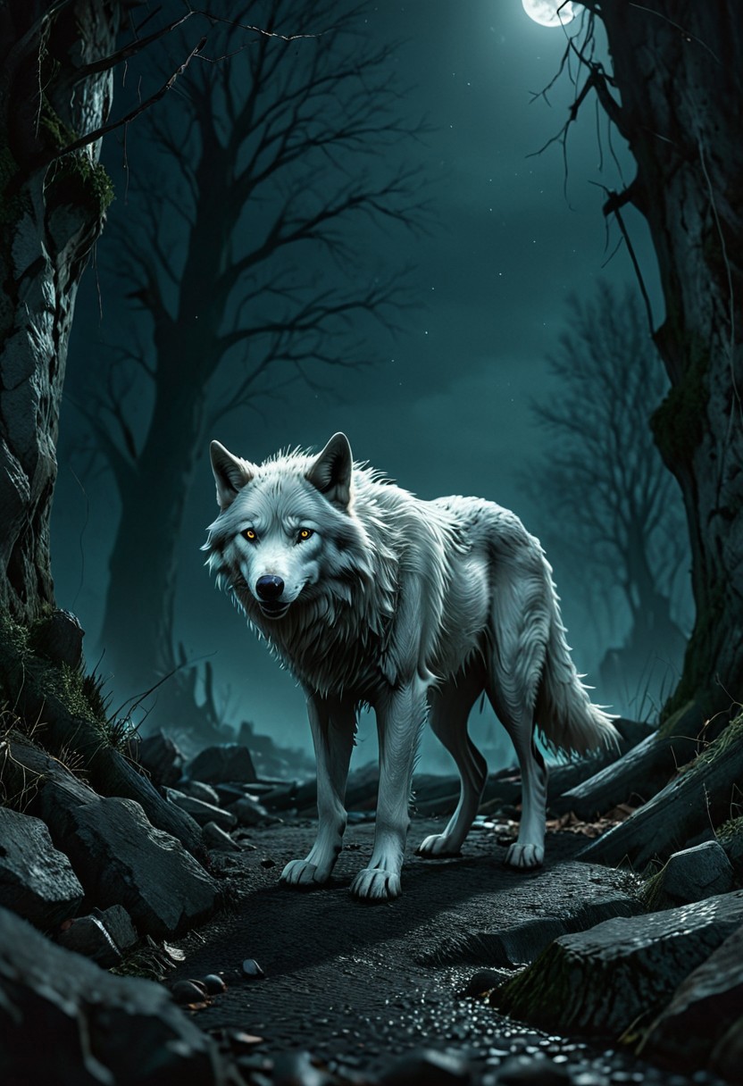 A chilling horror-inspired scene features a sinister white wolf, shrouded in darkness, set against a backdrop of an ominous, moonless night. The ambient coloring and vast scale of the scene create an immersive atmosphere of dread and isolation, as the viewer is drawn into the haunting world of the mysterious, predatory wolf.