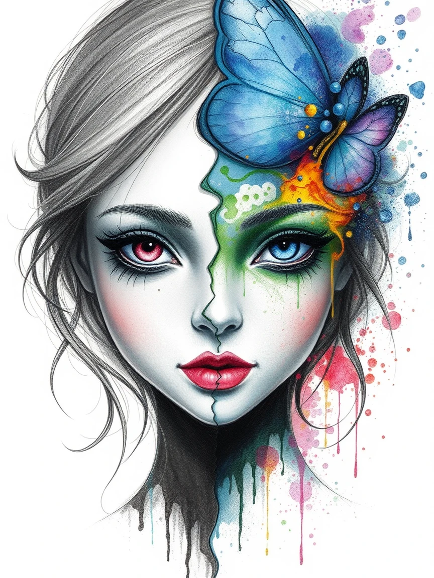 image of a faerie, the image is made using two distinct media, one half of the image is made using a graphite pencil, the other half is made using 3D alcohol ink, splash of color,