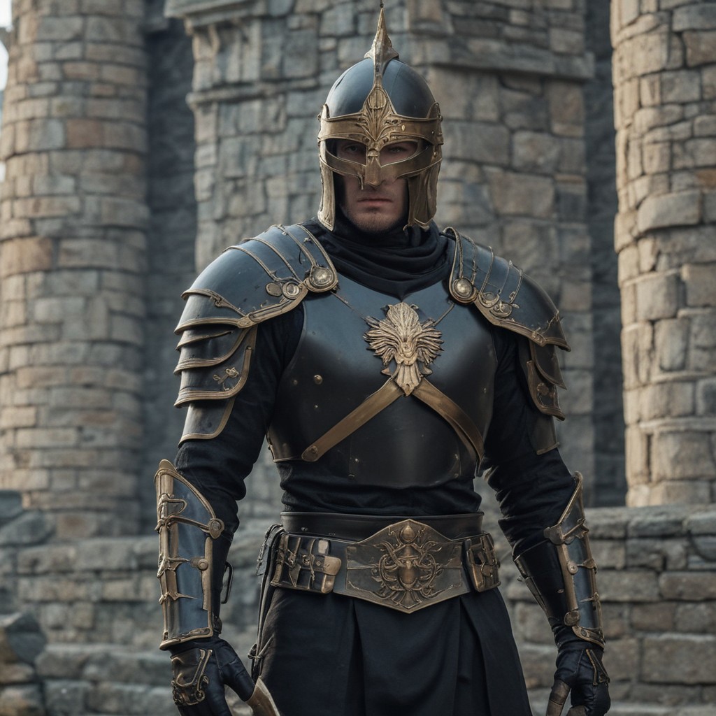 a close up of a warrior on a castle, black armored uniform, he has an elongated head shape, kneehigh boots, circa 1 9 8 4, unused design, middle shot waist up, golden key, face shown, 2 8 mm color, front facing view, frontal shot, highly detailed, extremely beautiful, intricate, cinematic lighting, rich colors, ray tracing, hyperrealistic, photorealistic, cinematic landscape, trending on artstation, concept art,