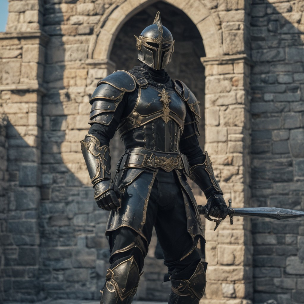 a close up of a warrior on a castle, black armored uniform, he has an elongated head shape, kneehigh boots, circa 1 9 8 4, unused design, middle shot waist up, golden key, face shown, 2 8 mm color, front facing view, frontal shot, highly detailed, extremely beautiful, intricate, cinematic lighting, rich colors, ray tracing, hyperrealistic, photorealistic, cinematic landscape, trending on artstation, concept art,