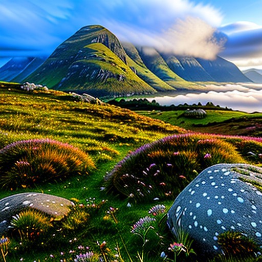 highland scotland landscape background, Clover, bunch grass, Crystals, rocks, crags, clouds and fog