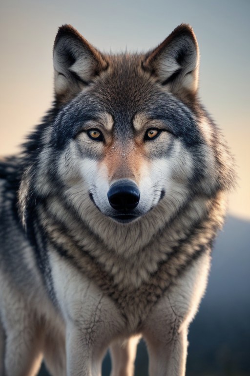 long shot scenic professional photograph of a wolf. A light pastel background with gentle curves enhances the scene. A detailed 3D rendering capturing warm lighting, soft shadows, and fuzzy texture, perfect viewpoint, highly detailed, wide-angle lens, hyper realistic, with dramatic sky, polarizing filter, natural lighting, vivid colors, everything in sharp focus, HDR, UHD, 64K