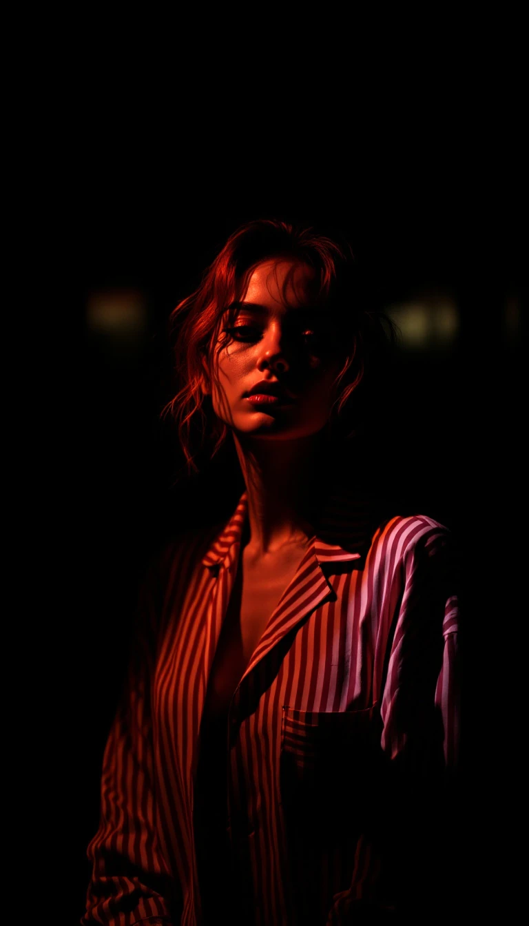 A7III_0006.DNG: photo of woman standing in a dark hallway, in the style of striped, neon pop, intense gaze, genderless, light amber and red, fujifilm neopan, digitally enhanced.