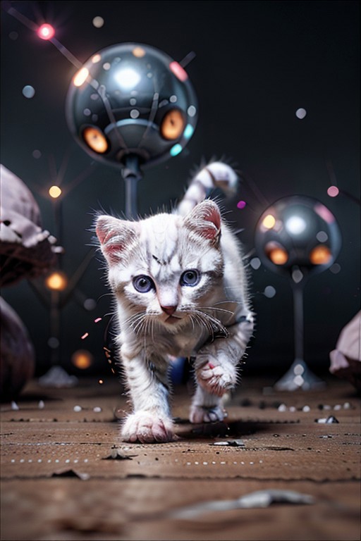 Capture a full hyper-realistic photograph of an adorable white kitten running in an alien planet being chased by grey aliens, cutest kitten in civitai, side view, chubby kitten, short legs, close up, c4d, blender, raytracing, unreal engine 5, render 3d,