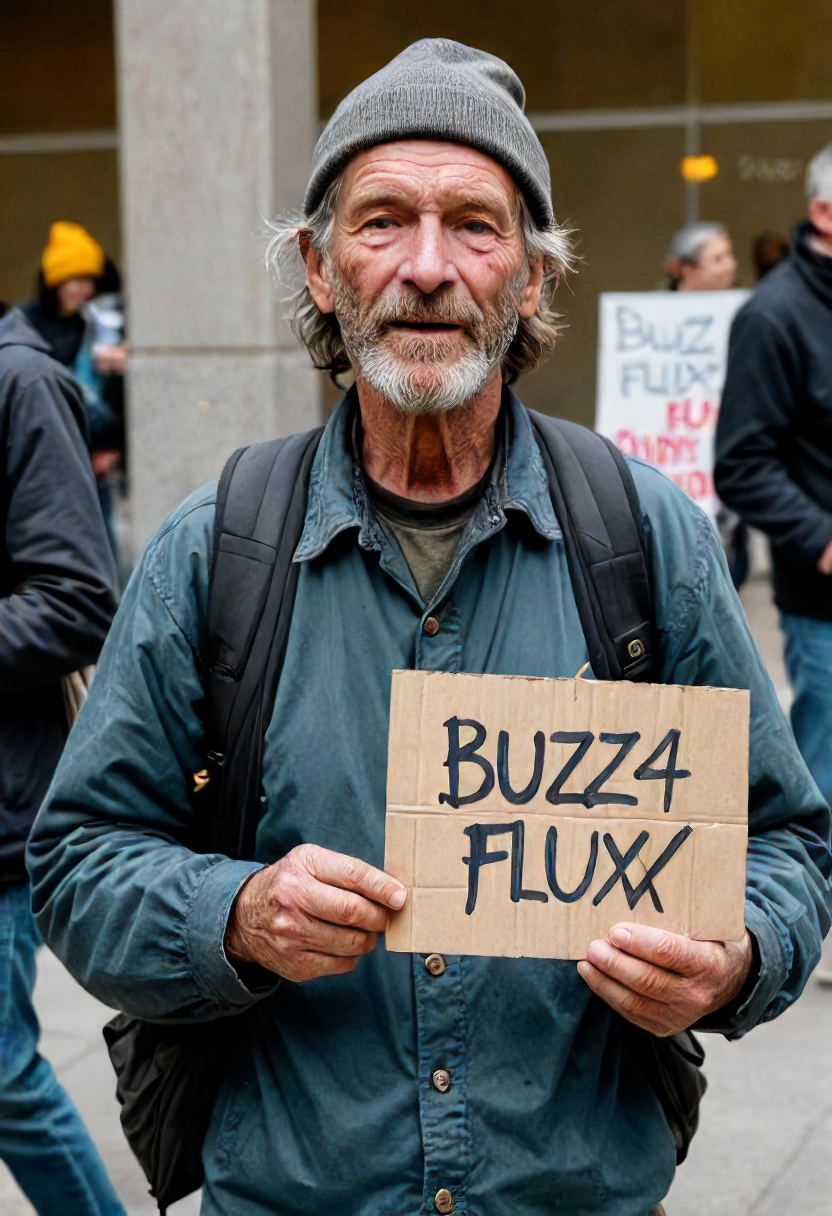 A homeless man holding a sing that says "BUZZ 4 FLUX" <lora:add-detail-xl:1>