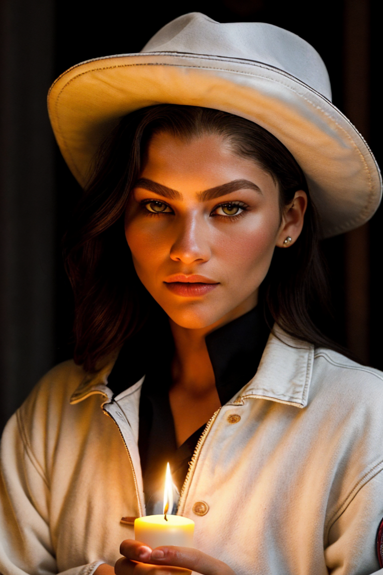 <lora:zendaya-01:1> z3nd4y4, 1girl, upper body,, Trucker Jacket, Old Postcard, Photomontage, asymmetry, Candlelight for a warm and intimate ambiance (Candlelight).