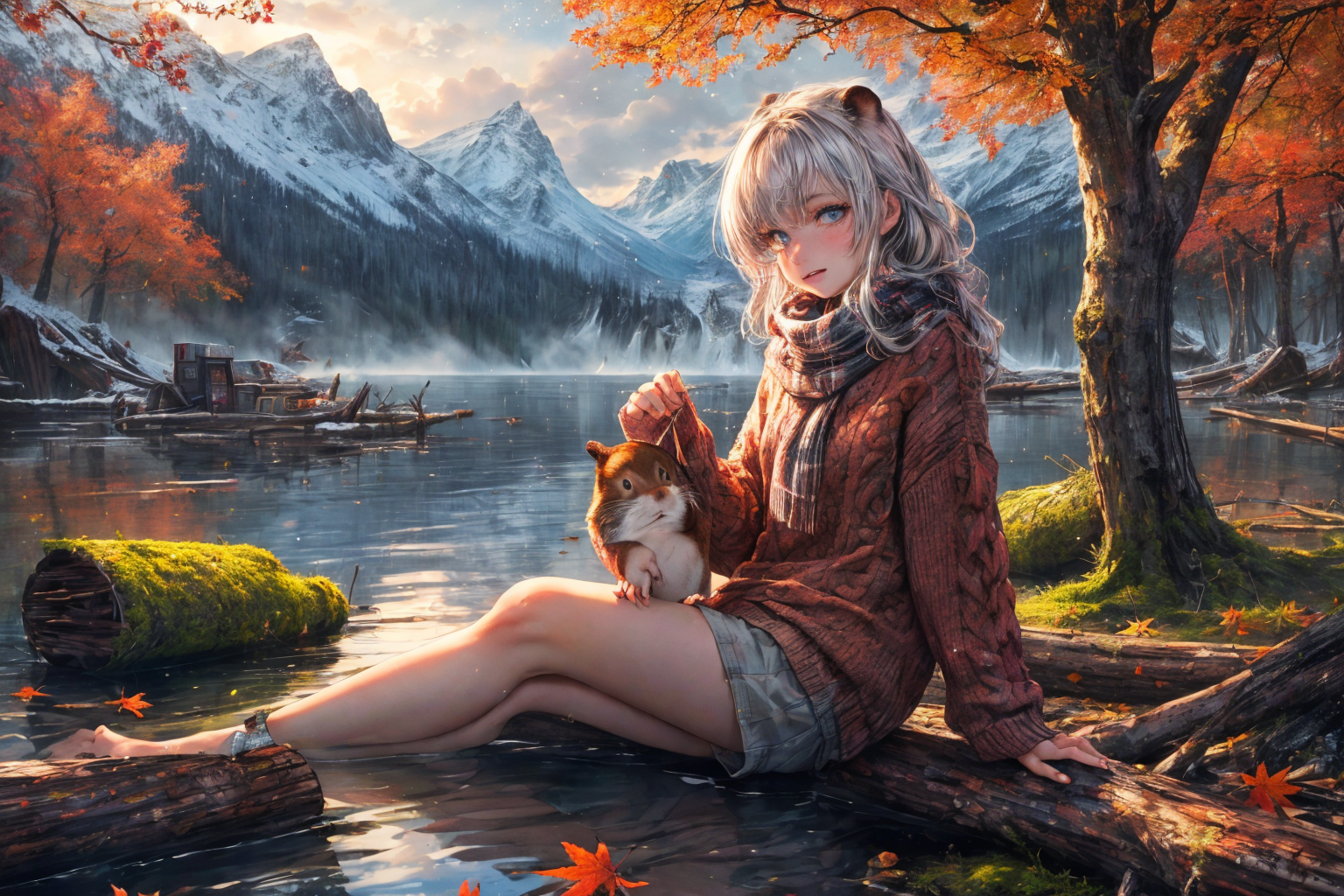 (RAW photo, 8k uhd, Analog style, Masterpiece, Best Quality, Highres:1.3), (dramatic, cinematic:1.2), BREAK, movie shot of realistic (1beaver:1.35) wearing (sweater:1.4) (sitting:1.2) on (island on lake:1.2), (beaver tail, (paws:1.05):1.15), (holding stick:1.1), (river, detailed autumn mapple pine forest:1.2), (fabulous small house, beaver village:1.2), (mountains:1.1), (falling leaves:1.2), (wooden (logs:1.15), (moss:1.1):1.2), (morning, fluffy cloud:1.25), (godrays, light particles, colorful:1.3), looking at viewer, (frontal:1.2), BREAK, (photorealistic, no humans:1.3), (quadruped:1.35), (wearing plaid sweater:1.35), ((scarf:1.1), cute (eyes:1.15), full body:1.1), (wildlife photo, photo by discovery channel:1.2), (fantasy fabulous dream world, shiny:1.3), (soothing calm mood:1.2), (scandinavian northern nature, outdoors, steam, waterfall, cliff, (aurora:1.05):1.1), snow, brown, (rodent teeth:1.1), BREAK, <lora:more_details:0.8>, <lora:zoom_slider_v1:3.8>,