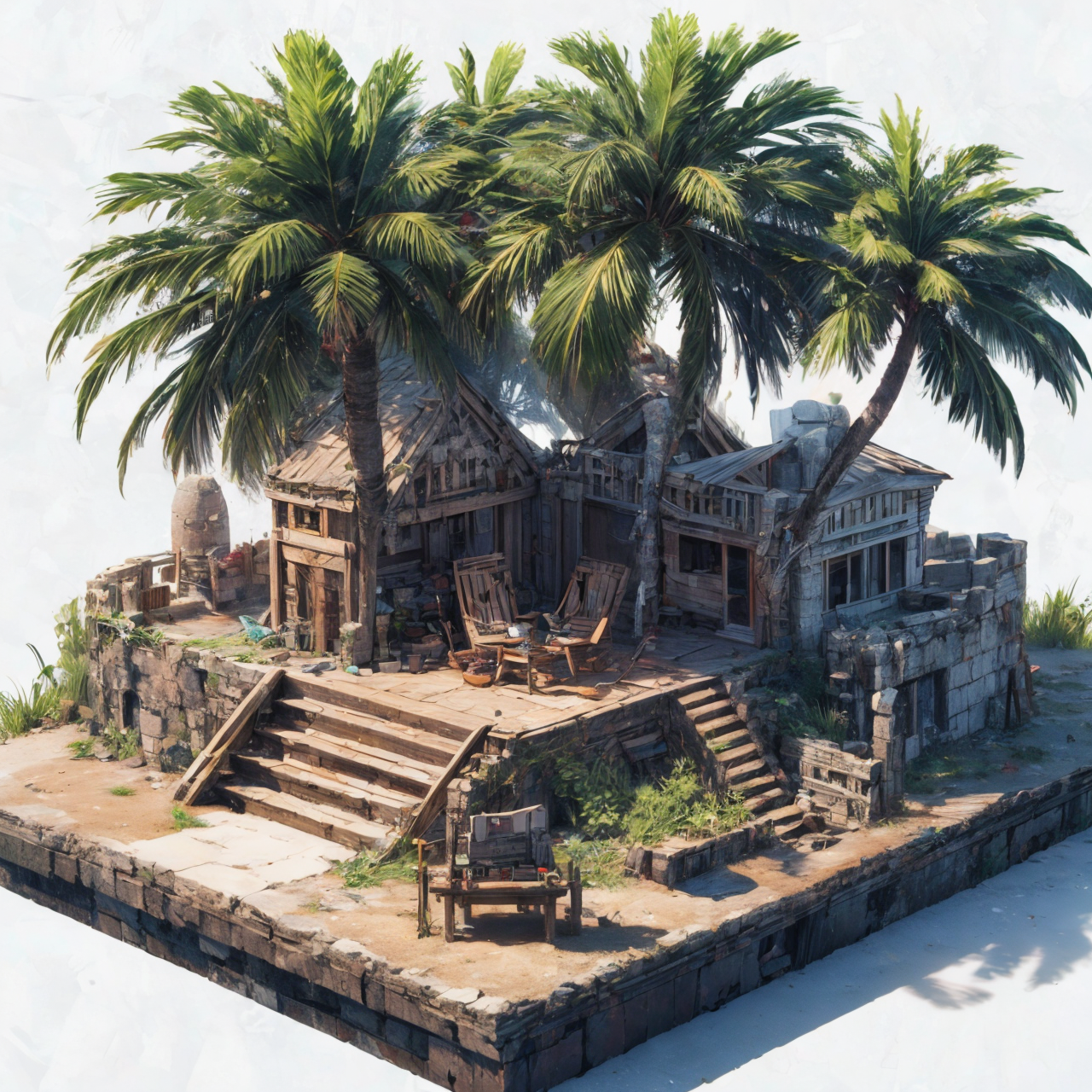 RAW photo, 8k uhd, Analog style, (Masterpiece, Best Quality, Highres:1.3), dramatic, cinematic, BREAK, (Isometric perspective:1.4) (Pixar style:1.2) (3D model render:1.3) of little (intricate:1.2) (ancient elven beach ruins:1.32), (deck chair, stairs, (palms:1.26), (car, rocks, sand (castle:1.11):1.1):1.1), (fence:1.02), ((overgrown:1.07) desert, sand, well, (campfire:1.15):1.05), ((white background:1.1), solid background, global illumination, raytracing, modeling, HDR, octane render, unreal render, miniature:1.2), (hyperdetailed, absurdres:1.1), BREAK, <lora:more_details:1.0>