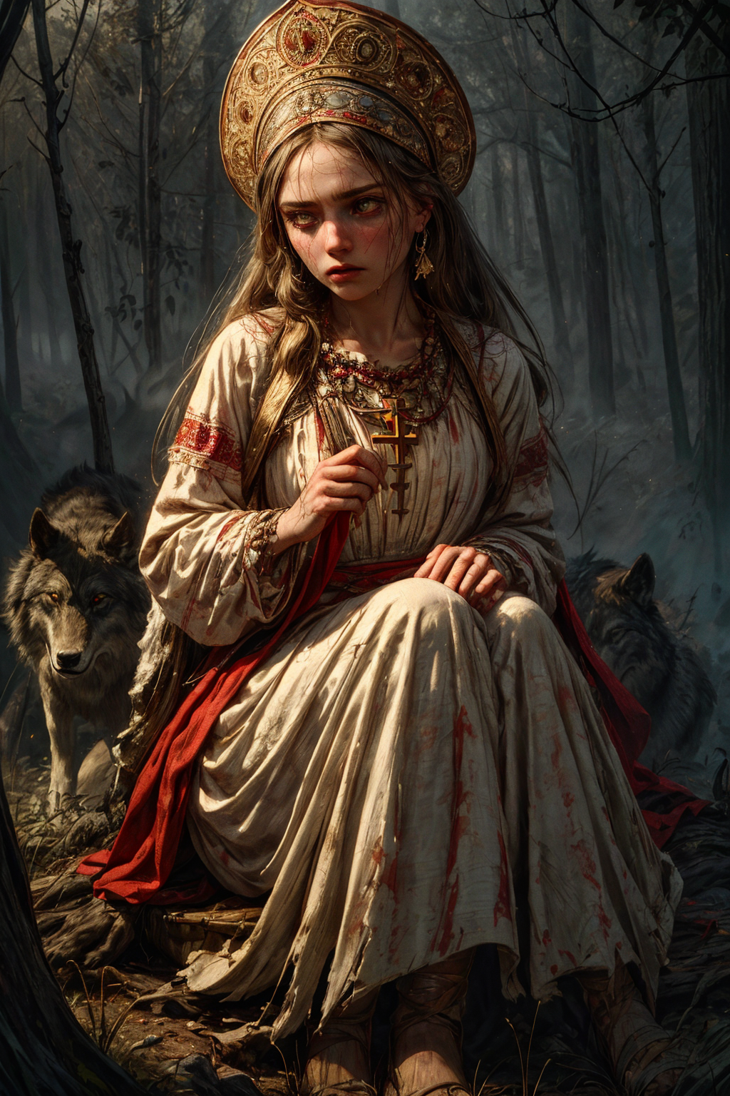 (RAW photo, 8k uhd, Analog style, Masterpiece, Best Quality, Highres:1.4), (dramatic, cinematic:1.2), BREAK, movie shot of (cute young:1.2) girl wearing (russian:1.2) (white:1.1) (open (torn:1.1) (long:1.1) dress:1.25), (small kokoshnik headwear:1.25), (circlet:1.25), (tired pose:1.2), (messy (very long:1.1) hair:1.15), (dirty skin:1.2), (dirty clothes:1.15), (looking down:1.3), (head tilt:1.2), (surrounded by wolves:1.3), (sitting:1.3) (on stump:1.25) in (overgrown dence deep forest:1.2), ((ornate:1.15), traditional ornamented (red frills:1.1):1.1), (sad face:1.15), (cross necklace:1.1), BREAK, (giant old trees:1.3), moon moonlight, (outdoors, fireflies:1.1), (tired:1.2), (gloomy, scary, eerie dark night:1.3), (photorealistic:1.2), (intricate details:1.3), (mysterious, fabulous, fantasy, mystical, eerie, gloomy:1.3), (desaturated, cold lighting:1.2), medieval peasant, ((russian peasant clothes, traditional russian, slavic folk art:1.1), By Andrey Shishkin:1.2), (hyperdetailed, absurdres:1.2), BREAK, <lora:more_details:1.0>, <lora:sxz-slavic-fantasy-v1:0.7>, <lora:zoom_slider_v1:4.2>,