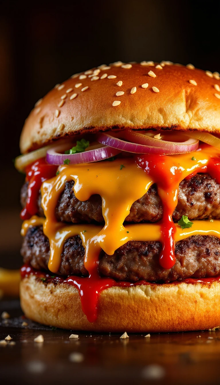 A7III_0006.DNG: **Extreme close-up shot of a mouthwatering, indulgent burger, showcasing the perfect harmony of flavors and textures. The double meat patties, cooked to a juicy, caramelized perfection, are generously topped with melted cheese that stretches and oozes out of the frame. A tangy, crimson sauce adds a pop of color and a hint of sweetness, while thinly sliced onions add a punch of crunch and freshness. The browned bread, crispy on the outside and soft on the inside, provides a sturdy base for this gastronomic masterpiece. Side lighting casts a warm, golden glow on the burger, accentuating the textures and highlighting the succulent juices. The overall aesthetic is reminiscent of a high-end product photo, with every element meticulously styled and lit to showcase the burger's irresistible appeal. The image is captured with a high-quality camera, resulting in an ultra-sharp, crystal-clear photograph that's so vivid, you can almost smell the sizzling meat and taste the savory flavors. The shallow depth of field blurs the background, drawing the viewer's attention to the star of the show: the burger. The mood is one of comfort, indulgence, and satisfaction, making the viewer's stomach growl with anticipation.**
