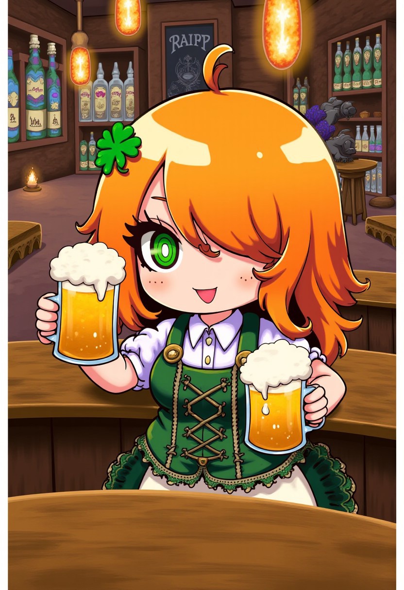 art by benangbaja, 1girl, long orange hair, hair over one eye, Irish barmaid, green barmaid, bodice with criss-cross laces, collared shirt, shamrock hair ornament, serving beer mugs, tavern, tables, chibi, big head, kawaii
