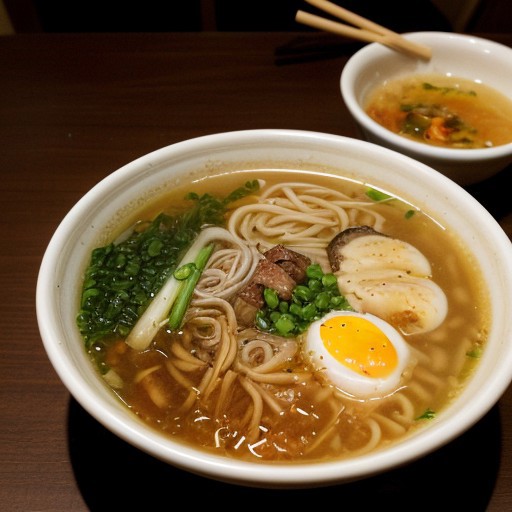 A steaming bowl of traditional Japanese ramen with a rich, flavorful broth. The bowl is filled with thick noodles, tender slices of chashu pork, a soft-boiled egg with a runny yolk, bamboo shoots, and fresh green onions. The broth is slightly oily, with a hint of miso or soy. The setting is a cozy, warm atmosphere, with chopsticks resting on the side.