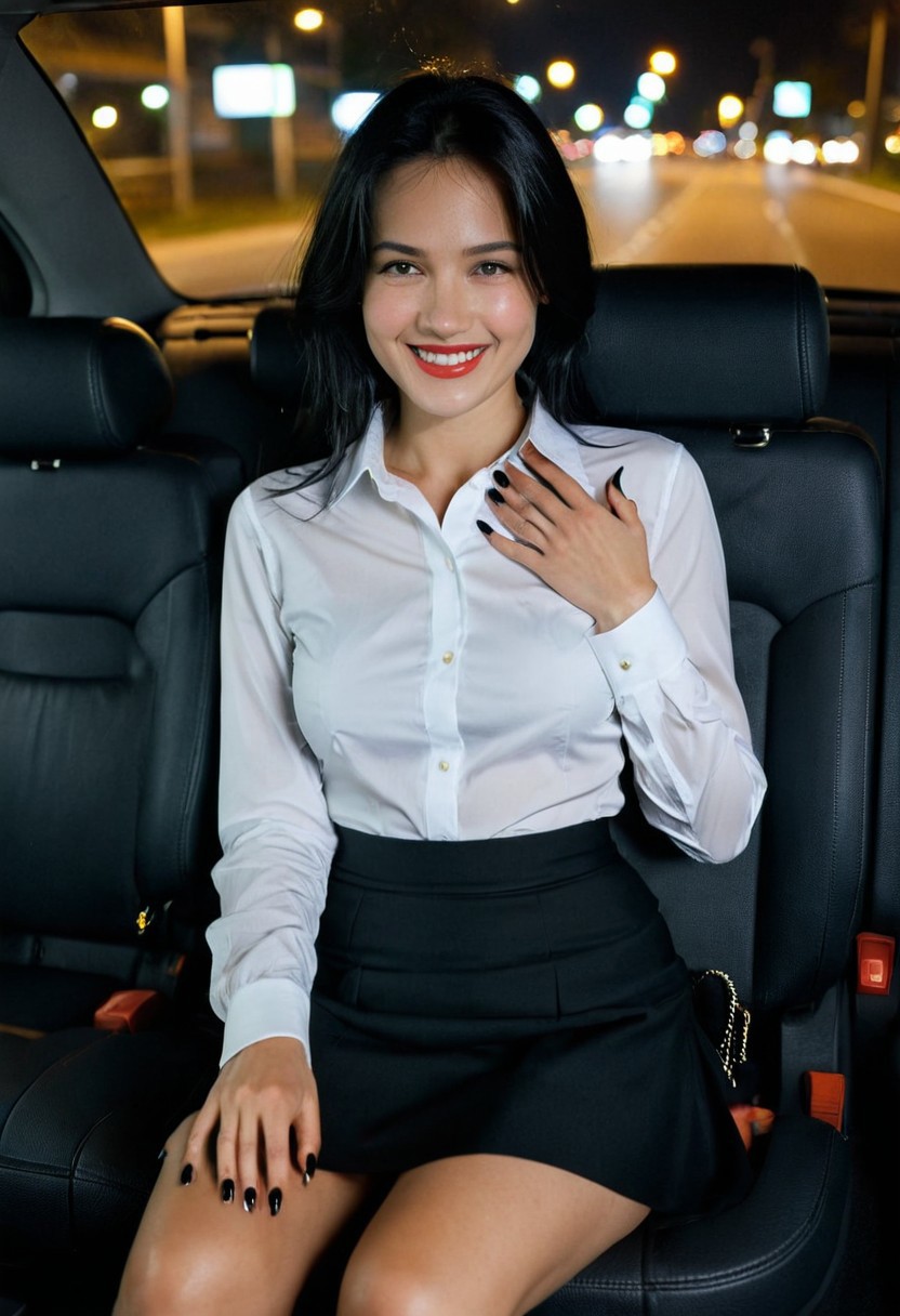 score_9, score_8_up, score_7_up, BREAK, GLSHS, 1girl, solo, black hair, shirt, white shirt, sitting, black nails, long sleeves, black skirt, skirt, parted lips, nail polish, smile, in the car, night, shirt lift, nipples, small breasts