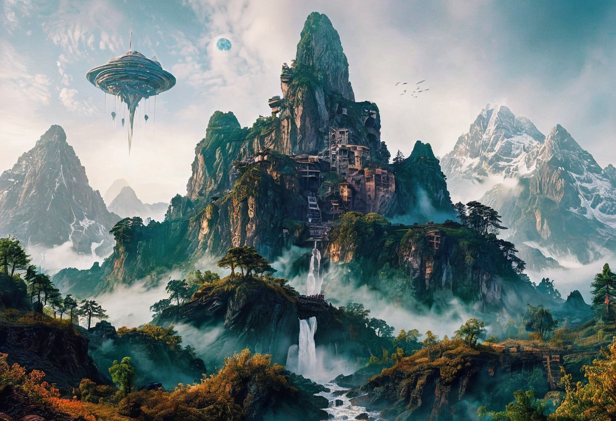 Visualize a futuristic mountain, symbolizing online community in the style of incorporate elements that evoke a sense of building with a large spaceship complex, elegant, expansive, fantastical, film photography style, heavy grain, alien trees, mists, waterfalls, gravity weirdness, strange physics, strange world, alien world, psychedelic