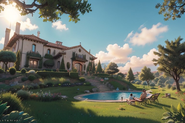 digital illustration, highest quality, highly detailed, masterpiece, best quality, ,,art by Donato Giancola )ADDBASE, grass, tree, bush, nature, scenery, outdoors, day, ((Spanish style villa exterior)),the villa has red roof tiling arched windows,stone walls and stucco,afternoon time ,beautiful landscape,nice pool , family and their puppy enjoying the pool in the sunny day, 8k uhd, dslr, soft lighting, high quality, on_grass, tree_shade, plant, sky, tree_stump, road, jungle, blue_sky, under_tree, field, foliage, garden