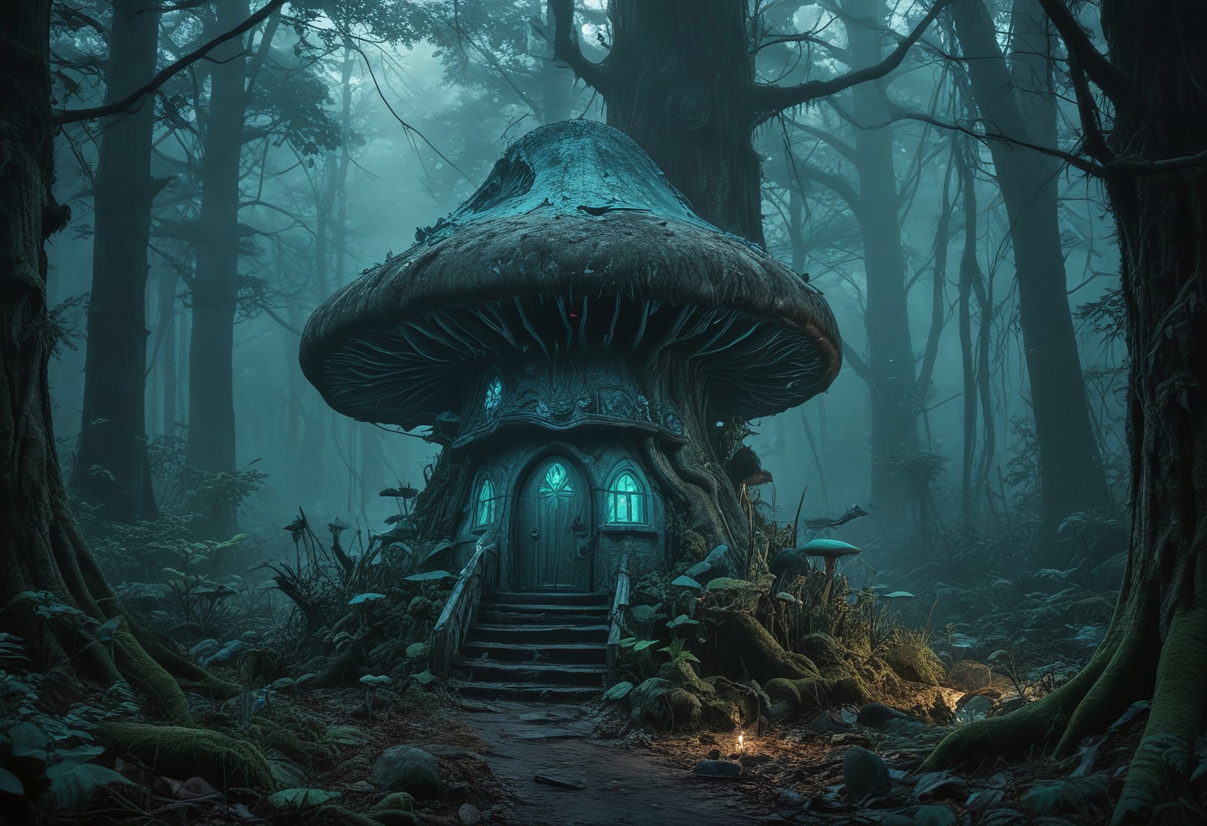 Realistic Expressionism. Bioluminescent digital art. Medium shot. A Smurf mushroom house in an enchanted forest with a smoke-made Batman in the foreground. Atmospheric perspective. Ethereal, glowing fungi. Muted, emerald green color scheme with radiant, hyperluminescent blues and purples. Intricate, detailed textures. 8k resolution. Masterpiece. H.R. Giger, surrealism, eerie atmosphere, neon-like lighting, futuristic, dark fantasy, eerie forest, mystical, dreamlike, uhd cinematic