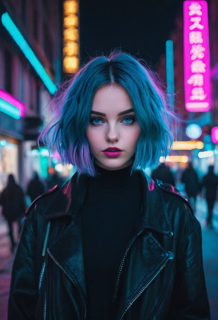 instagram photo, cinematic photo, saturated colors, city street, neon, fog, night, cyberpunk city, volumetric, closeup portrait photo of young woman in dark clothes, azure hairs, short haircut, grey eyes, circle earrings, pink earrings, looking to viewer, perfect face, perfect eyes, bob haircut, pale skin, magenta steam from mouth, opened mouth, peace sign fingers