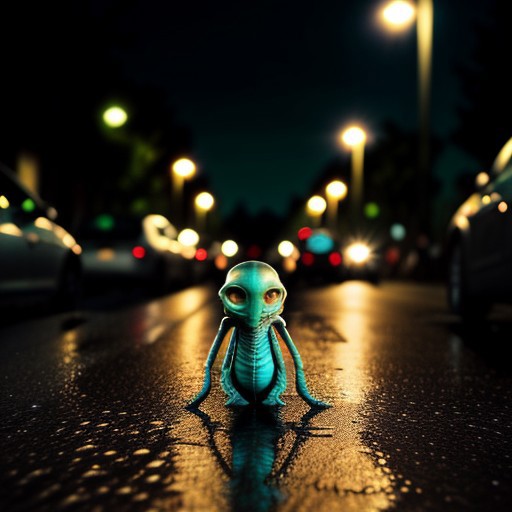 close up movie shot of cute (stray cyan alien:1.2), fluffy fur, green eyes, mysterious appearance, (wet asphalt:1.1), reflections, street lights, (cars, pedestrians, crowd:1.2), (from below:1.1), dynamic, (ghetto street:1.1), (night:1.1), puddles, rain, trash, gloomy, colorful dark lighting, expressive, photorealistic, drsmatic, cinematic look