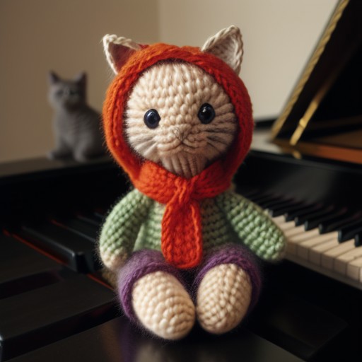 a cat made from knit, weaved cat, An amigurumi cat on the piano, knit cat, a photo-realistic portrait, captured with a Canon EOS R5 camera and a macro lens for detailed wildlife portraits. The high-resolution, HDR image has a National Geographic-style aesthetic.detailxl,knitting