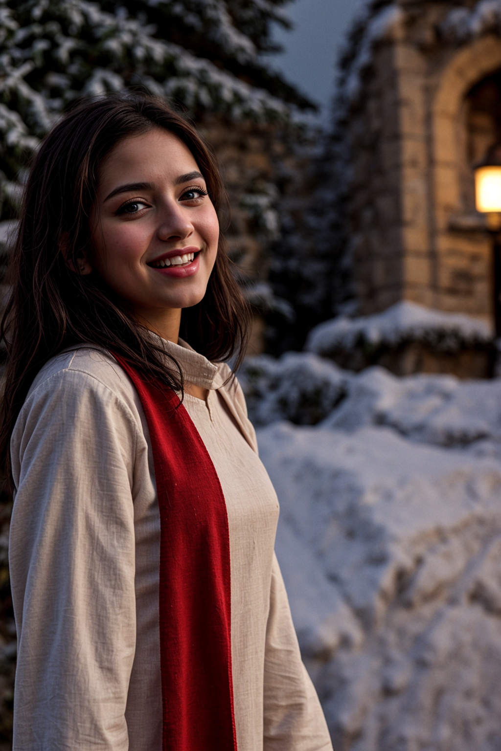 petite small person pakistani hijabi woman, laughing, <lora:add_detail:0.5>, <lora:real_skin:0.5> skin, dglatte, looking at viewer <lora:pcm_sd15_smallcfg_2step_converted:1>, RAW photo, 8k uhd, dslr, soft lighting, high quality, film grain, Fujifilm XT3, lr, Snowy Winter Wonderland with Ice Castle, back view, low angle, wearing plain heavy weave shortssleeve pastel red sherwani, candid, amateur, unposed, badly framed, full body,