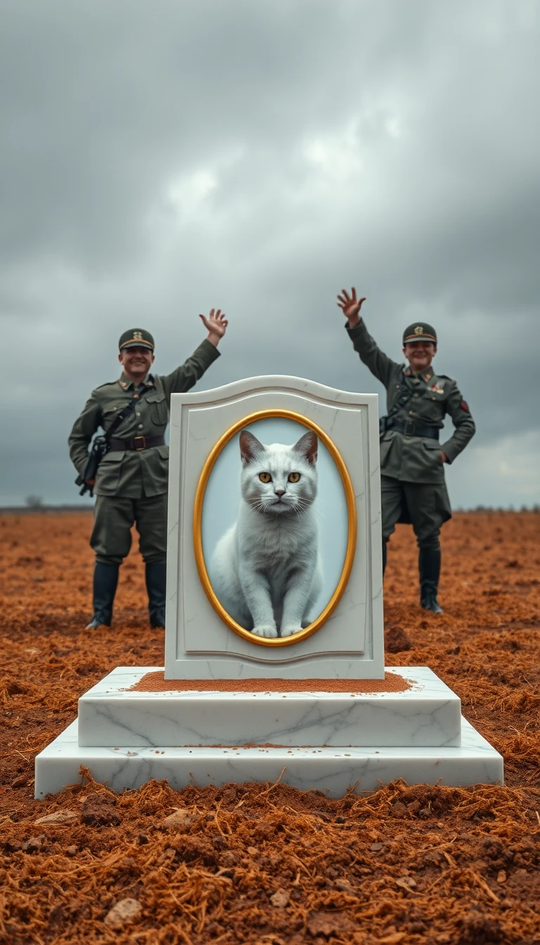 In a desolate field, a lavish tombstone with a peculiar cat image dominates the center, while two German soldiers from 1945 celebrate enigmatically under a gloomy sky. The characters will be named as Klaus and Heinrich. Arid field (coordinates 0,0,0) covered with ochre-colored dry grass #C19A6B, rough and brittle texture, evenly distributed over 70% of the site. Exposed soil sienna-colored #8B4513, granular texture, visible on the remaining 30%. Sky (top coordinates) blue-gray hue #708090, with vertical gradient darkening upwards. Center tombstone (coordinates 0,2,1) polished white marble #FFFFFF, rectangular shape 1.5m height x 0.75m width, 2cm beveled edges, subtle gray veins #D3D3D3 randomly distributed. Oval photograph (coordinates 0,2,1.2) 30cm x 20cm, gold frame #FFD700 1cm thick. Cat in photo: dominant white fur #FFFFFF, soft and silky texture. Black spot #000000 on head (relative coordinates 0.1,0.9,0 to 0.9,0.7,0) forming a low Roman haircut, 2cm long, covering the top of the head from ear to ear. Black nose #000000 (relative coordinates 0.5,0.45,0), small triangular shape. Black spot on mouth (relative coordinates 0.5,0.4,0) rectangular 2cm wide x 1cm high, simulating a small mustache. Intense blue eyes #0000FF, almond-shaped, black dilated pupil #000000, fixed and threatening expression towards the observer. Klaus (coordinates -2,2,0): height 1.80m, athletic build. German military uniform 1945 without insignia: feldgrau grey jacket #4D5D53, 4 front pockets with center pleat, metal buttons #B87333, stand-up collar. Matching trousers, black leather boots #0C0C0C mid-calf. Short blond hair #FFD700, green eyes #00A86B, fair complexion. Upright posture, right arm raised in celebratory gesture. Heinrich (coordinates 2,2,0): height 1.75m, robust build. Uniform identical to Klaus. Dark brown hair #3B2F2F, brown eyes #654321, tanned complexion. Holding green glass bottle #0B6623 in left hand, white label with illegible text. Joyous expression, mouth open in apparent exclamation. Fortified bunker (coordinates 0,-5,0): partially underground entrance, visible 3m above ground level. Grey concrete structure #808080, rough texture. Large dark grey steel doors (coordinates 0,-5,1) #404040, 4m high x 3m wide each, with visible rivets and sturdy handles. Downward access ramp in front of doors, 30-degree incline. Large sign (coordinates 0,-4,3) above entrance: rusty metal #8B4513, text "BERLIN" in white capital letters #FFFFFF, bold sans-serif font, 1m high x 4m wide. Ground around bunker slightly raised and with signs of recent excavation, scattered mounds of darker soil #654321